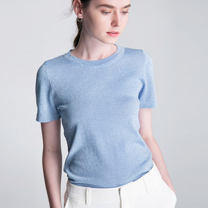 波光蓝色多瑙河 纯色紧身上衣亮丝蓝色t恤短袖女2019新款显瘦
