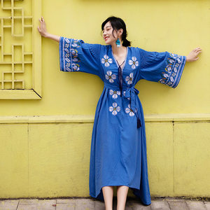 花锦溪《蓝色多瑙河》夏沙滩海边度假波西米亚V领长款仙女连衣裙